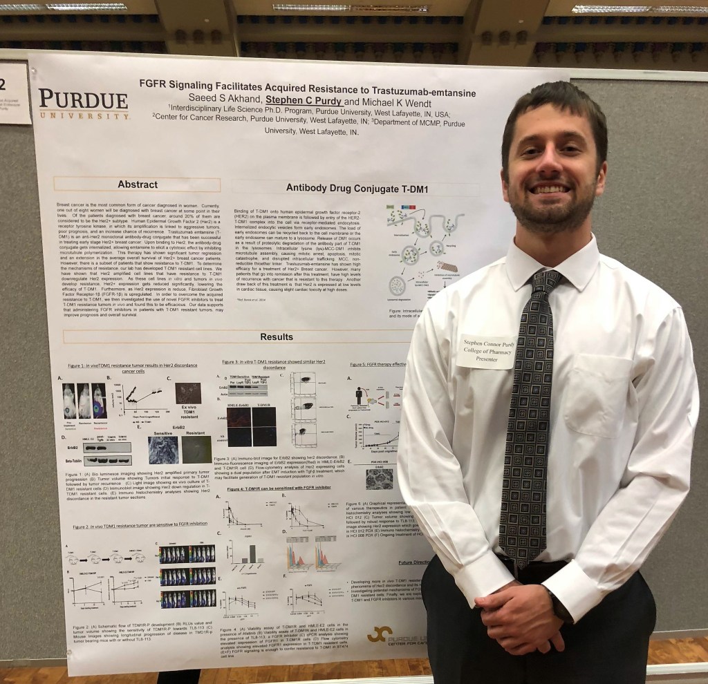 Purdy is a recent graduate from the College of Pharmacy. His research focuses on targeted therapies for HER2-positive breast cancer. He worked with Dr. Michael Wendt, an assistant professor of medicinal chemistry and molecular pharmacology, and Saeed Akhand, a Purdue graduate student, to understand how these cancers develop resistance to certain therapies and how to treat these patients.
