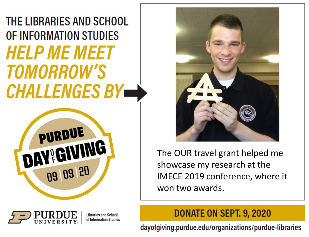 The Office of Undergraduate Research provides OUR Travel Grants to student researchers who need financial assistance to attend a conference, whether to support transportation or conference registration fees. Lucas appreciates past OUR donors who helped his own conference travel. “When you donate to OUR, not only are you supporting Purdue and helping Purdue students excel in their career, you are also helping to make the world a better place by supporting projects that make a difference,” said Lucas.