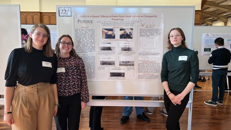 Bella Taylor ’25, Serena Wesley ’25, and Collete Plue ’26 are Animal Science majors at Purdue with minors in various biology concentrations. Together, the three researchers won an award for the Top Stem Poster at the 2023 Spring Undergraduate Research Conference. This award is provided by the Purdue chapter of Sigma Xi, the Scientific Research Honor Society. Their research, entitled “What’s in a quack? Effects of Pekin duck vocalizations on conspecific physiology,” focused on how hormones and the brain affect behavior in birds. Their research project is mentored by Dr. Gregory Fraley, associate professor and Terry & Sandra Tucker Endowed Chair of Animal Sciences.