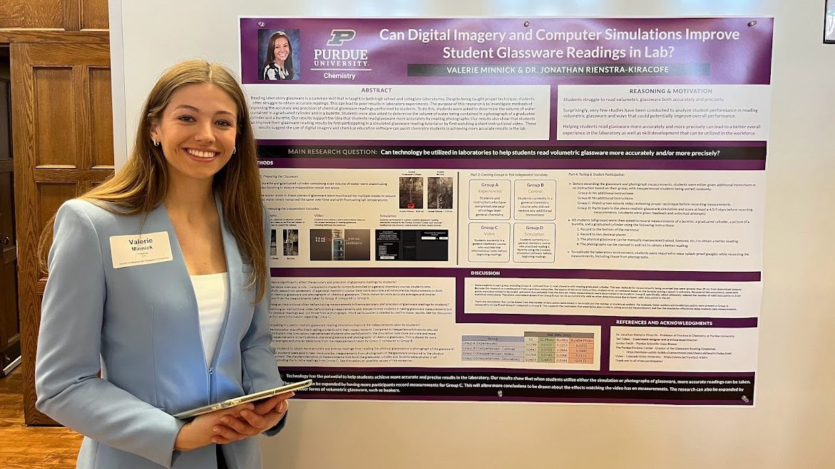 After finishing her freshman year, Valerie learned about projects within the Purdue College of Science that caught her interest. She decided to talk to one of her professors, Dr. Jonathan Rienstra-Kiracofe, a professor of practice in the Department of Chemistry, and he connected her to a position that fit her interests: a lab involving integrating technology, education, psychology, and chemistry. Due to the recent updates of Purdue’s Laboratories, this was a great time to focus on improving student glassware readings using digital imagery and computer simulations.